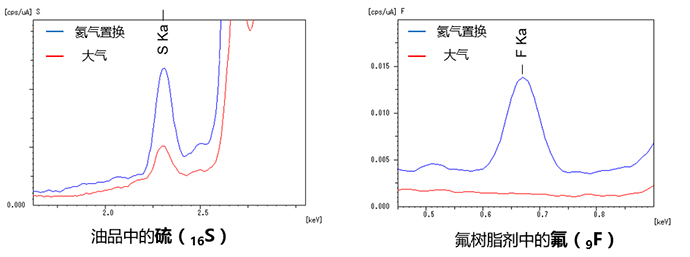2.液体样品中的氟在大气条件下基本无法检测,采用氦气置换则能够对应,如左图所示。