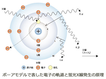 試料にX線管からのX線を照射すると、試料に含まれる原子から固有のX線が発生し試料外に放出されます。このX線は蛍光X線と呼ばれ、各元素特有の波長(エネルギー)をもっています。したがって、このX線の波長を調べることにより定性分析ができます。また、蛍光X線の強度は濃度の関数となりますので、元素特有の波長ごとにX線量を測定すれば定量分析をおこなうことができます。