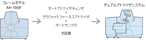 フレームモデルAA-7000FにオートアトマイザチェンジャAAC-7000(オプション)を装着すると、バーナとファーネスは一体化されて燃焼室内に常に設置しておくことができます。また、原子化部の一体化により、省スペースを実現しています。